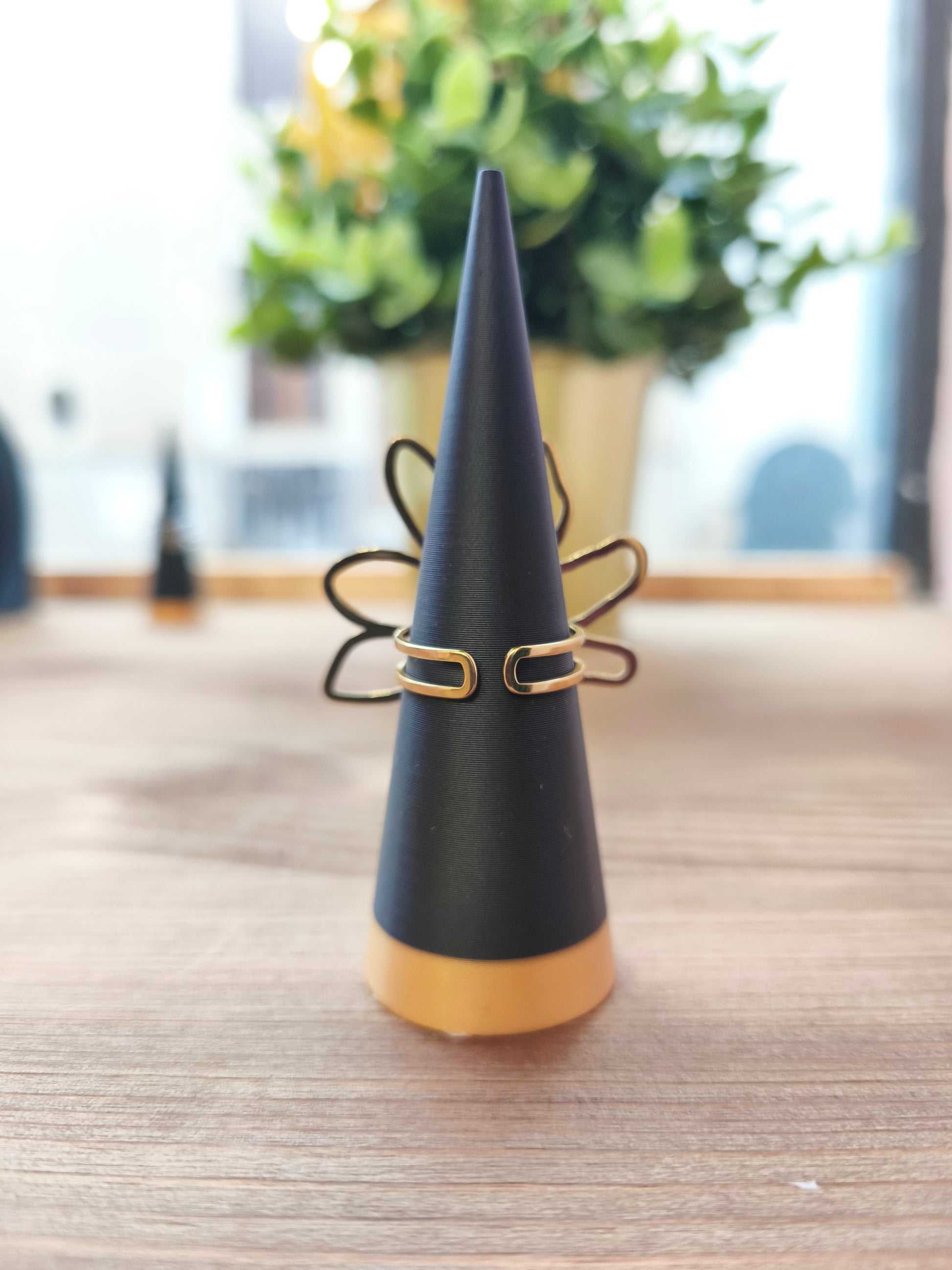 Bague dorée en forme de fleur sertie d'une pierre rouge. En acier inoxydable et réglable.