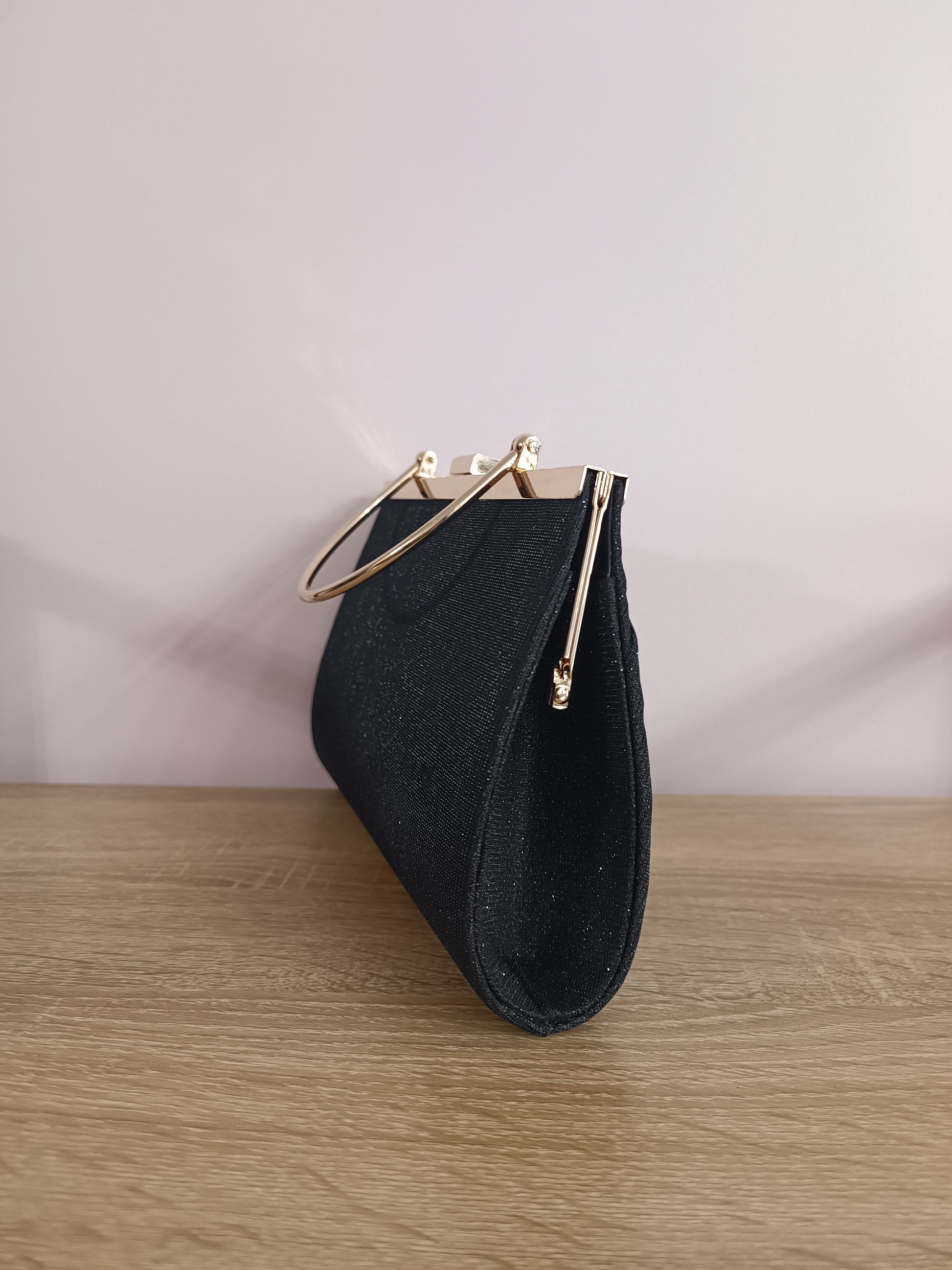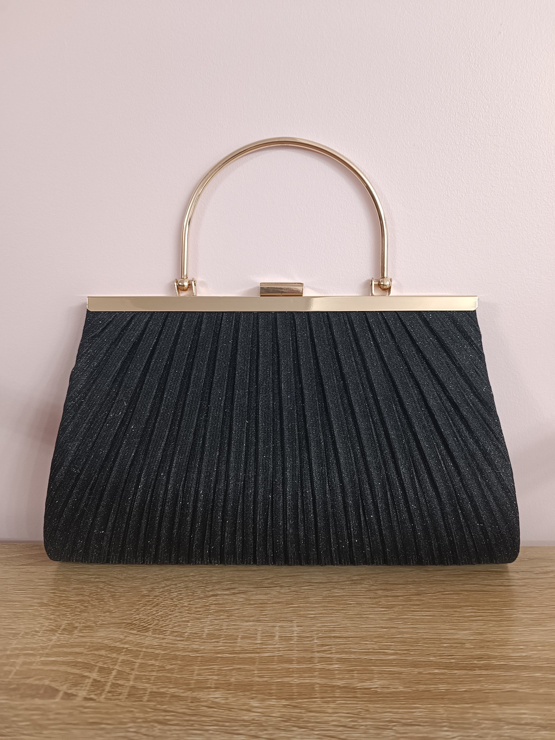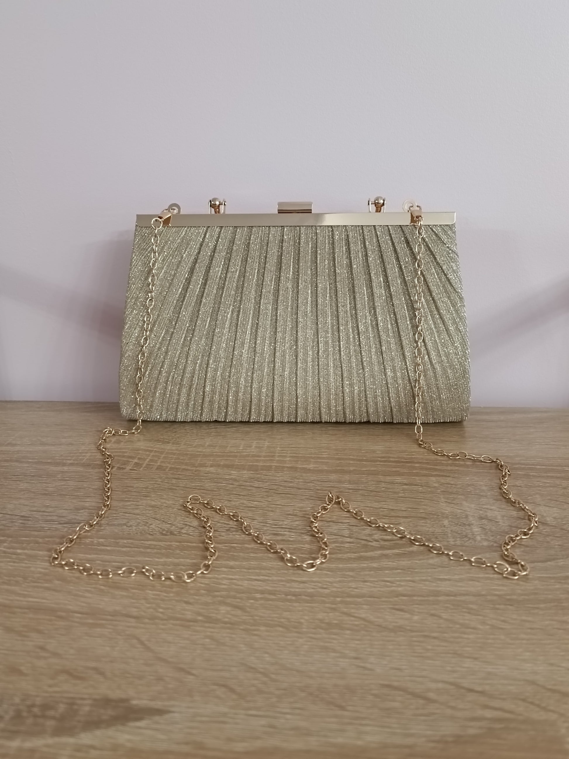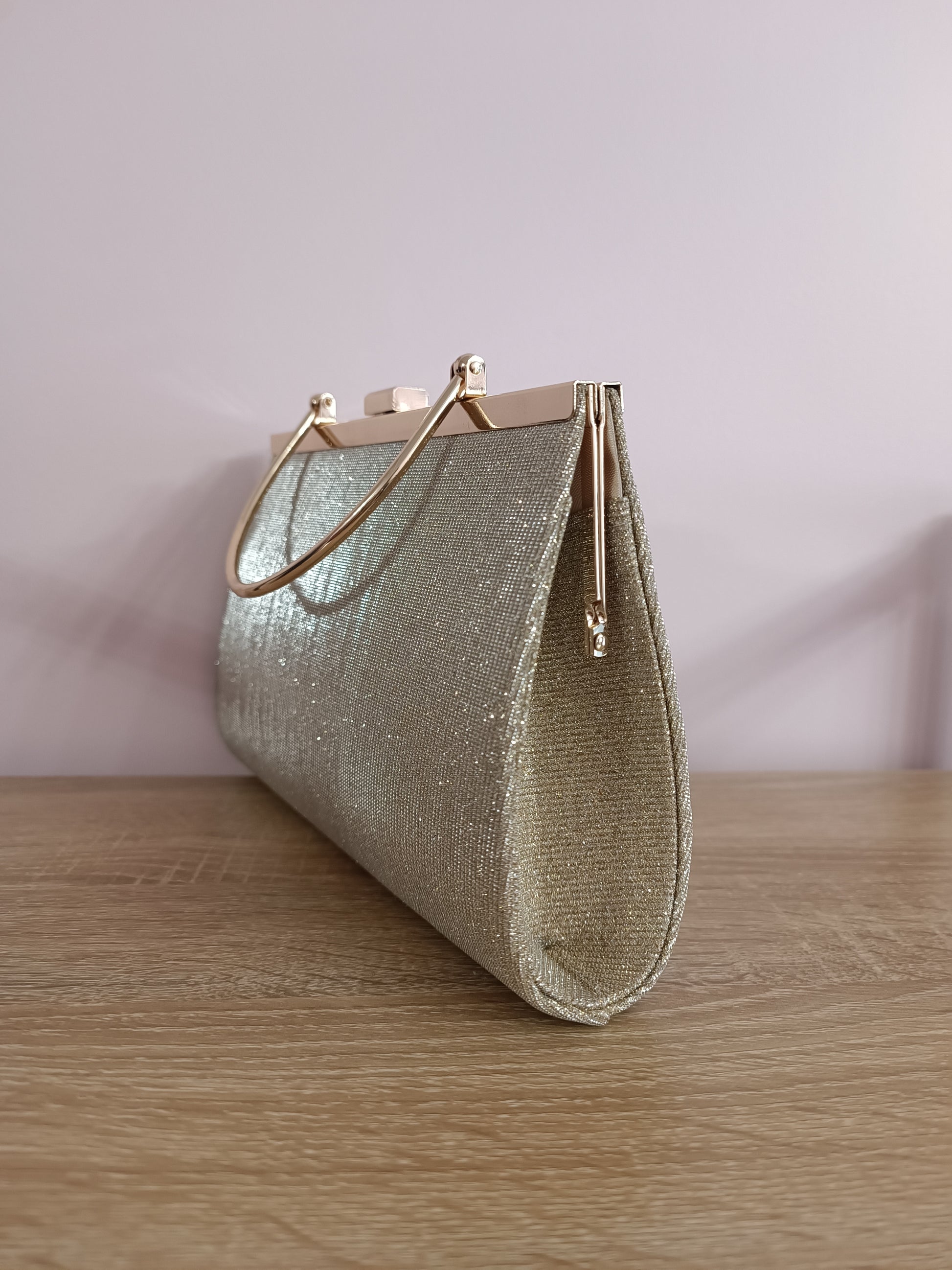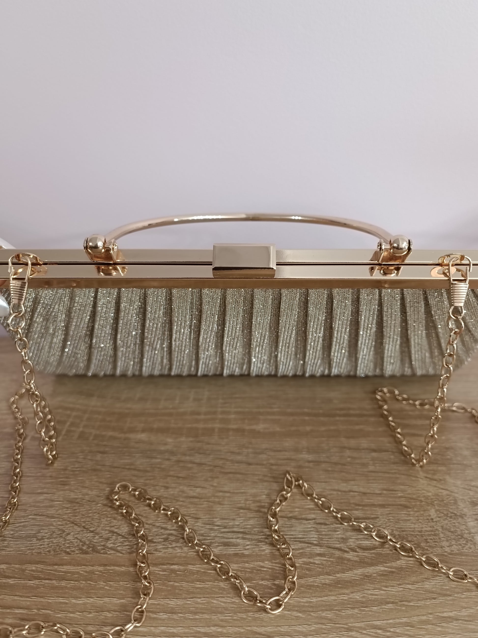 Mini-sac à main pailleté, avec une anse en métal et une chainette amovible.